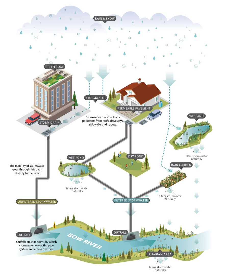 - نقل المياه الزائدة إلى خزان تخزين تحت الأرض، حيث يمكن إعادة استخدامها لري الساحات الأمامية أو الخلفية ومناطق المناظر الطبيعية الأخرى.